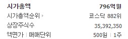 대주산업의 시가총액은 796억 원으로 코스닥 882위를 기록하고 있습니다.