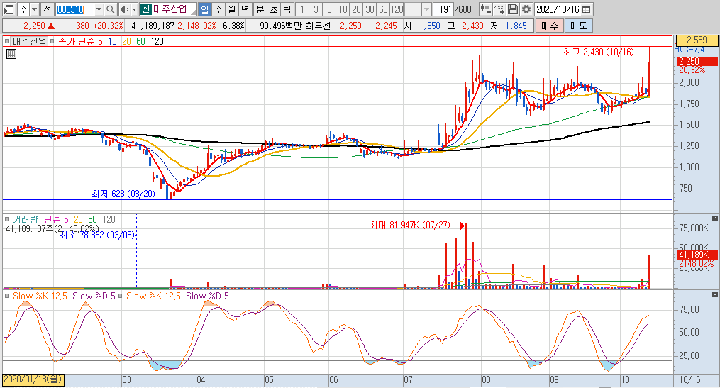 코로나 하락장으로 최저점인 623원을 기록하고 시장의 상승과 함께 상승했습니다. 큰 변동성 없이 시장의 흐름을 따라갔고, 7월 중순부터는 120선을 강하게 상향돌파 하더니 8월 초까지 크게 상승했습니다. 그 뒤로는 조정을 받았고 지지선에서 반등을 받았습니다. 그렇게 시세를 형성했고 10월 16일 20% 상승한 최고점 2430원을 기록했습니다.